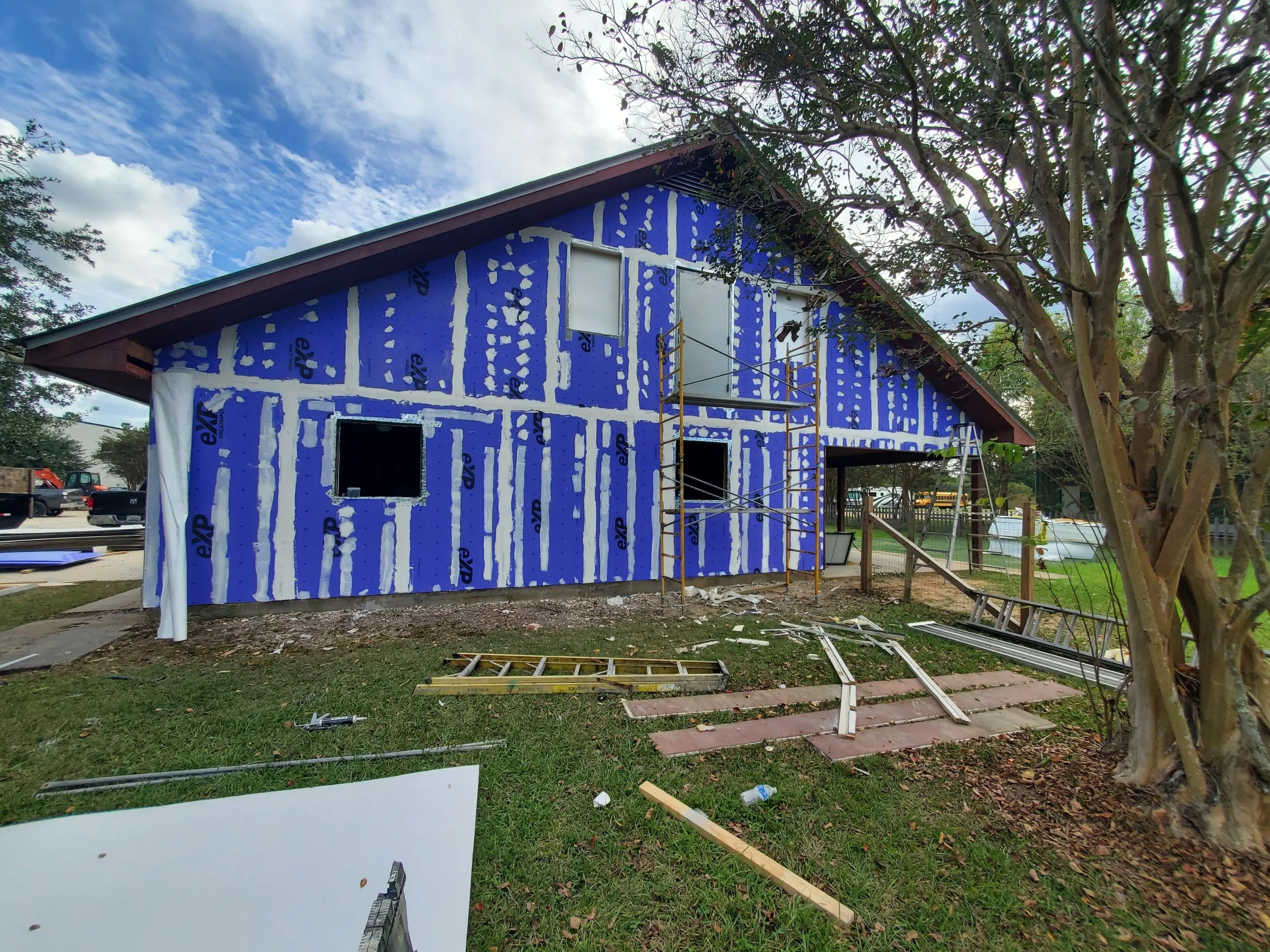 Midway through the work, a code review triggered a change order requiring a 1‑hour fire‑rated wall along the rear of the structure—an essential upgrade for school occupancy. To meet this requirement, we installed ⅝” Type X gypsum board to achieve the required fire rating, added Tyvek house wrap to improve moisture protection and energy performance, and continued the new siding installation over the upgraded assembly. To complete the transformation, we painted the full exterior for a cohesive, professional appearance.