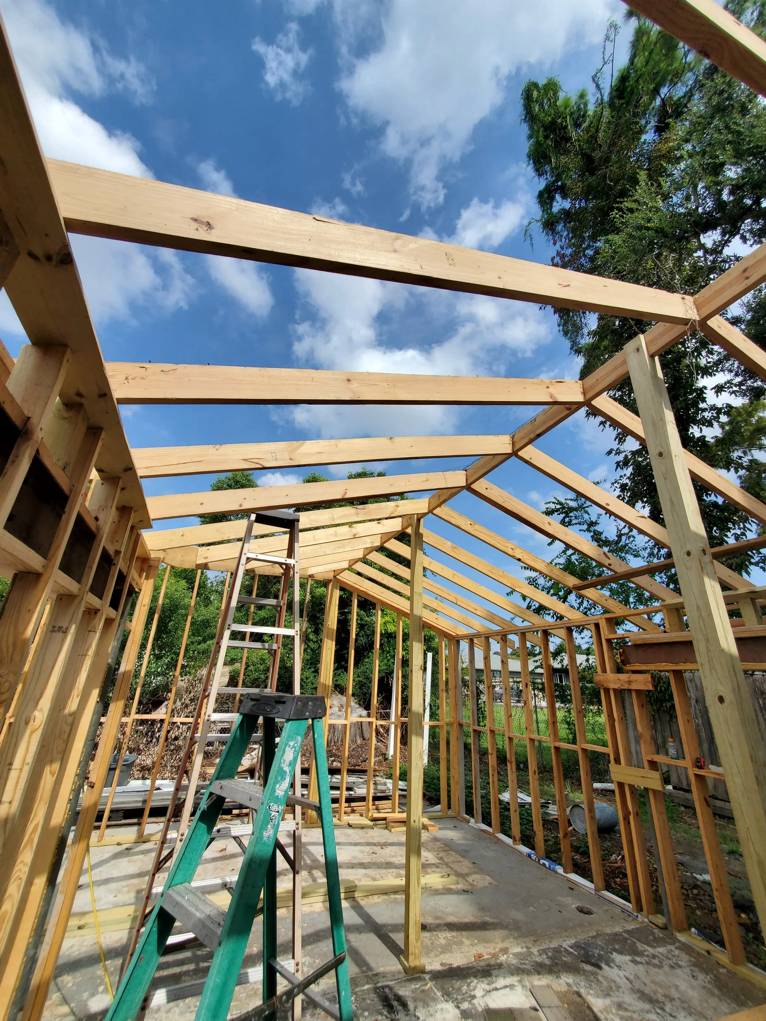We rebuilt this backyard shed from a state of total disrepair, starting with a structure that had a missing wall, a collapsed roof, and even a raccoon living inside. Once the debris and wildlife were safely removed, we framed new walls that expanded the footprint slightly and gave the building a sturdier, more functional layout. From there, we reframed the entire roof, tying together multiple rooflines to create a stable, weather‑tight structure before installing new flashing and metal roofing panels. With a new door, new siding, and fully trimmed exterior details, the shed went from an unsafe, unusable shell to a clean, solid, and fully rebuilt outbuilding that the client can rely on every day.
